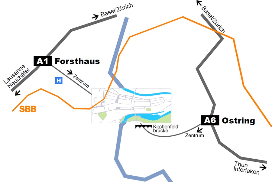 Benützen Sie die Autobahnausfahrt Bern-Forsthaus (A1) und folgen Sie der Murtenstrasse (Richtung Bahnhof) und anschliessend der Laupenstrasse. Biegen Sie links in die Schanzenstrasse ab. Die Einfahrt zum Bahnhof-Parking befindet sich auf der rechten Strassenseite. Achtung: Parkieren Sie im Parkhaus und nicht auf der für Zugreisende bestimmten Parkterrasse (nur Kurzparkzone). Nehmen Sie den Lift in den Bahnhof und folgen Sie dann dem Weg für Fussgänger (siehe oben).