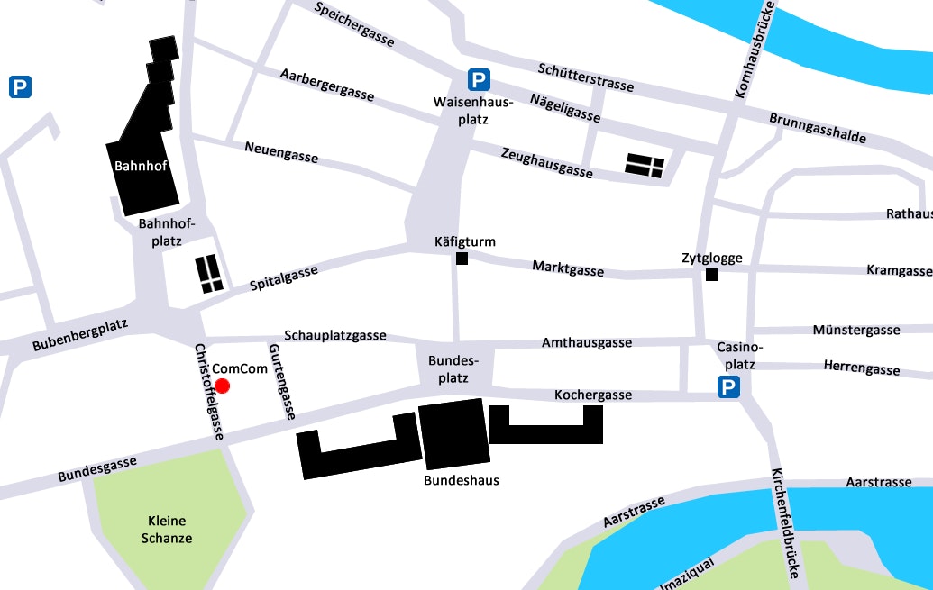 Vom Casinoplatz folgen Sie zu Fuss der Kochergasse (zu Ihrer Linken). Gehen Sie den Bundesplatz und anschliessend die Bundesgasse entlang bis zur Christoffelgasse (zweite Querstrasse zu Ihrer Rechten). Unsere Büros befinden sich im Haus Nummer 5.