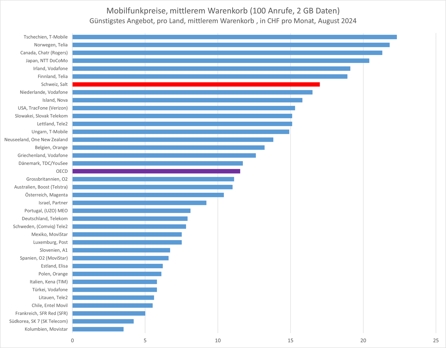 Für die Schweiz wurden die drei Netzbetreiberinnen Salt, Sunrise und Swisscom sowie die Zweit- und Drittmarken Yallo und M-Budget bei der Erstellung der Preiskörbe einbezogen. Darin sind Produkte und Optionen aus dem Prepaid- wie auch aus dem Abonnementssegment erfasst. Für einen mittleren Korb mit Sprach- und Datenverbindungen bezahlten Nutzerinnen und Nutzer in der Schweiz im August 2024 pro Monat 5.50 Franken mehr als im OECD-weiten Durchschnitt (17 gegenüber 11.50 Franken). Im Hinblick auf das günstigste Angebot belegt die Schweiz den 31. Rang und befindet sich damit im oberen Drittel der teuersten Länder. Nur gerade sechs Länder verzeichnen noch höhere Preise.