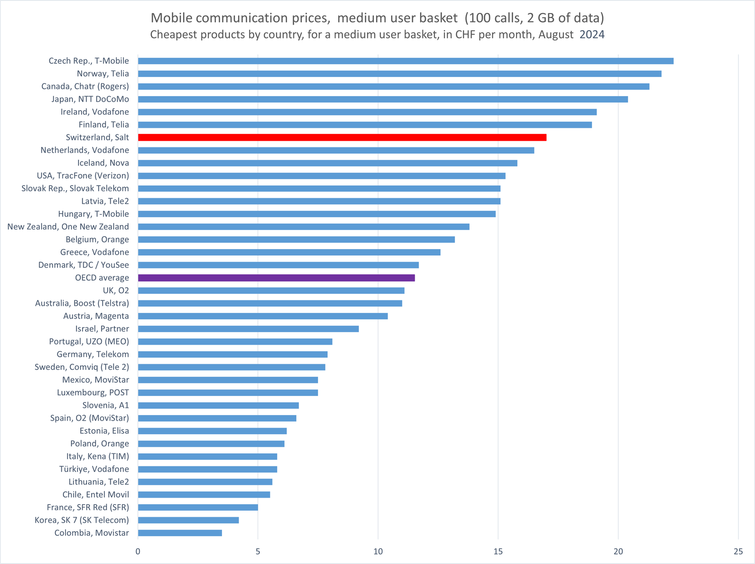 The baskets for Switzerland factor in the three network operators Salt, Sunrise and Swisscom, as well as the secondary and tertiary brands Yallo and M-Budget. These include products and service options from both the prepaid and contract segments. In August 2024, users in Switzerland paid CHF 5.50 more for an average basket of voice and data connections than the OECD-wide average (CHF 17 versus CHF 11.50). Measured in respect of the cheapest offer, Switzerland ranks 31st and thus falls within the top third of the more expensive countries. Only six countries have higher prices.