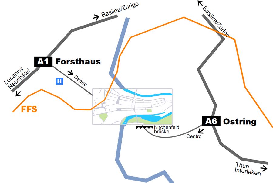 Prendete l’uscita Bern-Ostring (A6), seguite l’indicazione Zentrum, passando per l’Ostring, poi continuate sempre diritto lungo la Thunstrasse e attraversate la Thunplatz; continuate attraverso la Jungfraustrasse, poi Mariestrasse, fino all’ Helvetiaplatz, girate a destra e attraversate il ponte Kirchenfeldbrücke. Attenzione: una volta arrivati a Casinoplatz, girate due volte a sinistra entrando nella Münzgrabe fino a ritrovarvi all’ingresso del Casino Parking.