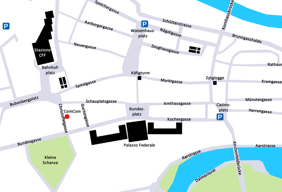 Per raggiungerci a piedi da Casinoplatz, prendete la Kochergasse alla vostra sinistra, andate sempre dritto costeggiando alla vostra destra la piazza federale e continuate lungo la Bundesgasse; infine, svoltate nella seconda strada a destra e sarete nella Christoffelgasse. I nostri uffici si trovano al numero 5.